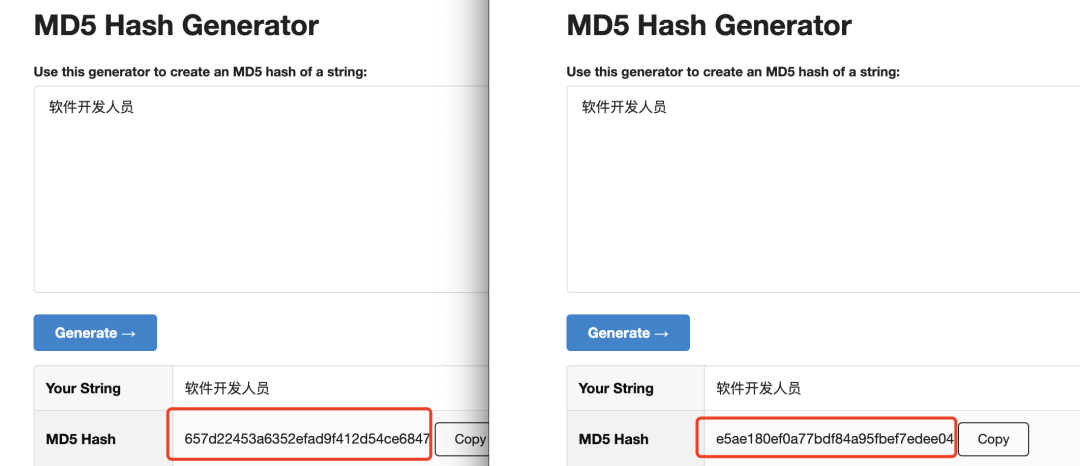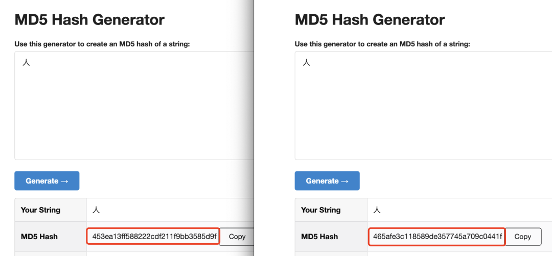 于是我分别用这两个字符串来生成 MD5 Hash 码,发现 Hash 码不同,说明原字符串不同。