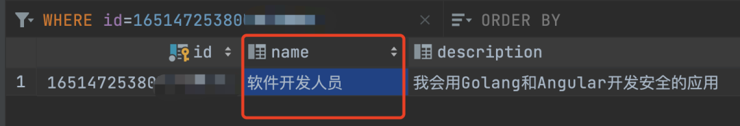 然后我又用助手的 id 去数据库中查询,发现确实有名称为 “软件开发人员” 的数据。