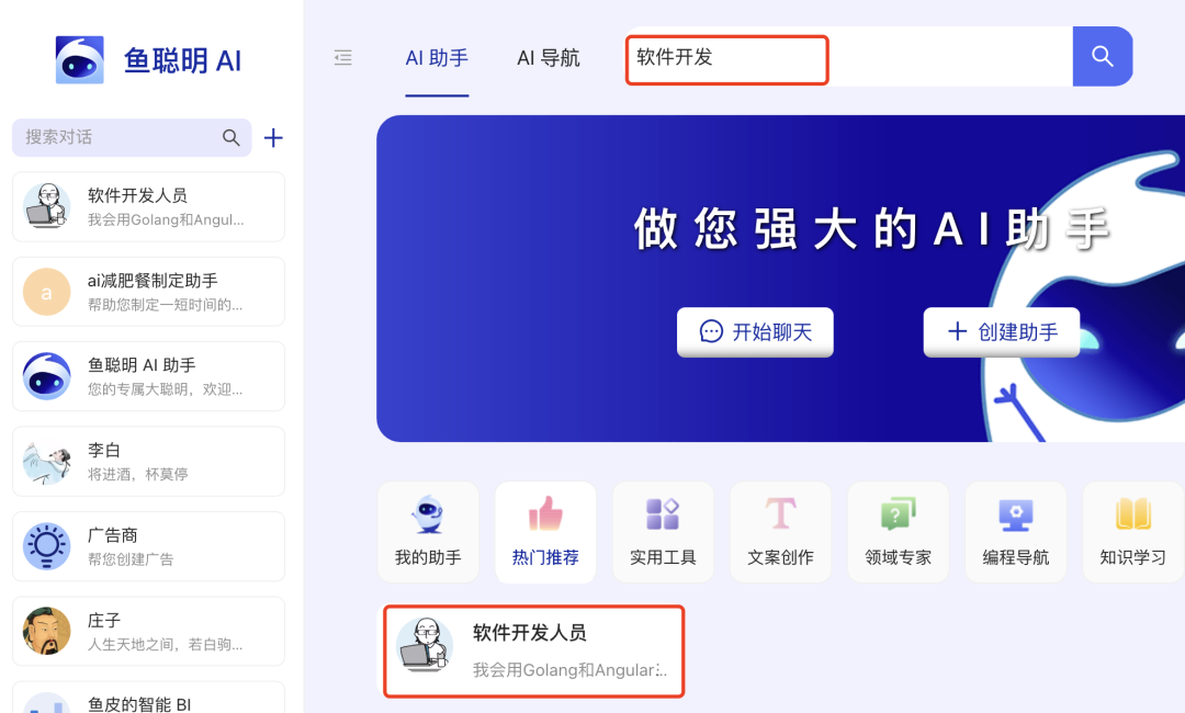 事情是这样的,有小伙伴在鱼聪明平台(https://www.yucongming.com)创建了一个 AI 助手,名称为【软件开发人员】。当我搜索 “软件开发” 时,能搜出这个模型: