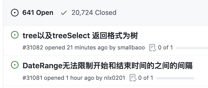 一般我们遇到官方组件的问题,或者是希望有什么新的特性,都可以发起一个 issues(问题)。大家看,Ant Design 不愧为知名项目,Bug 多问题多也很正常,都有 20724 个问题了!