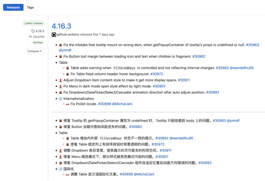 因此,在找 Bug 的起源时,我先登录 GitHub,找到 Ant Design 官方仓库,打开了版本(Releases)列表: