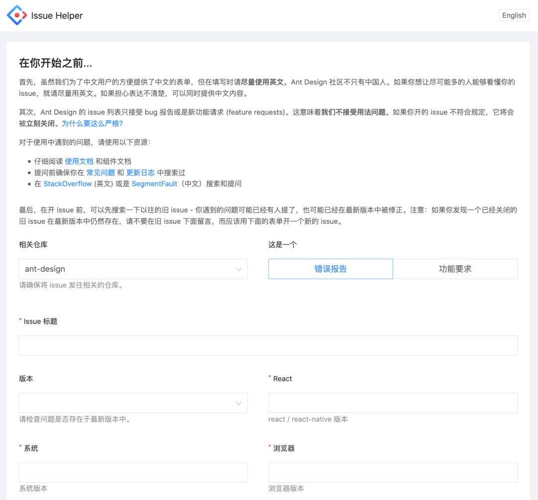 咱也有样学样提一个 issue,Ant Design 团队为了管理大家的问题,提供了一个问题表单页面,并且给你定好了一些规矩,避免一些乱七八糟不经搜索就直接提出的低质量问题。