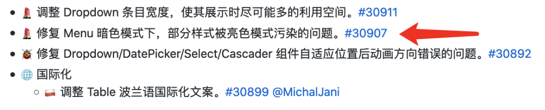 如图,该版本有一个改动是 “修复 Menu 暗色模式下,部分样式被亮色模式污染的问题”,很明显是改了 Menu 组件的代码!