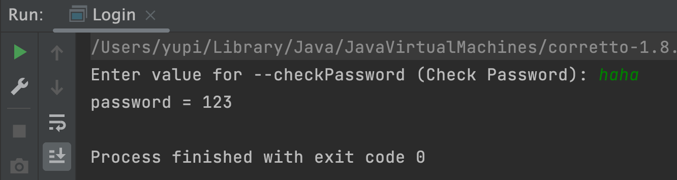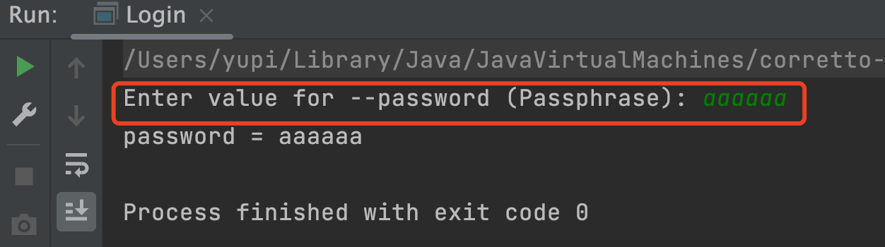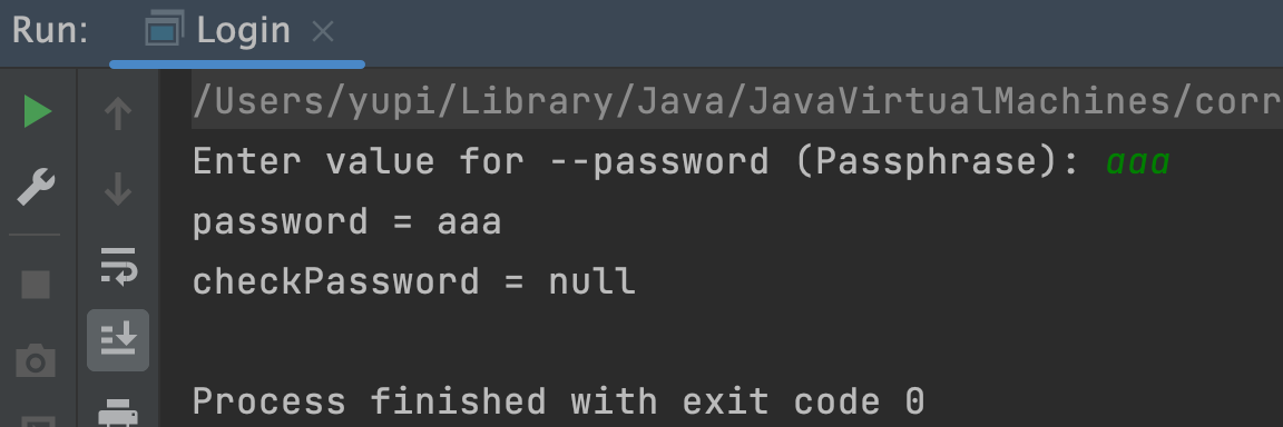 new CommandLine(new Login()).execute("-u", "user123", "-p", "123", "-cp");执行结果如图,不再提示让用户输入 password 选项,而是直接读取了命令中的值: