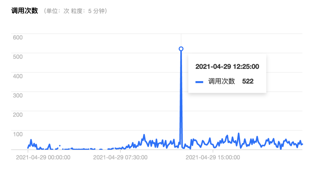 正常情况下,调用次数随时间的曲线图应该是下面这样的,夜里没人看,白天流量还算平稳,偶尔会有一些小高峰: