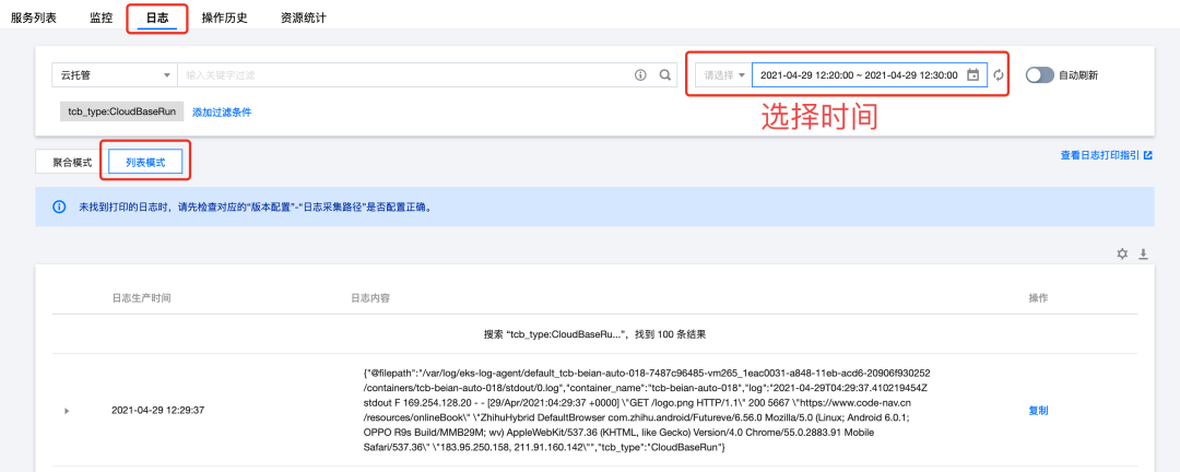 还好云开发帮我们记录了访问日志,选择事故发生的时间段(以 25 分钟为基准,前后各空 5 分钟),然后就筛选出了对应日志。