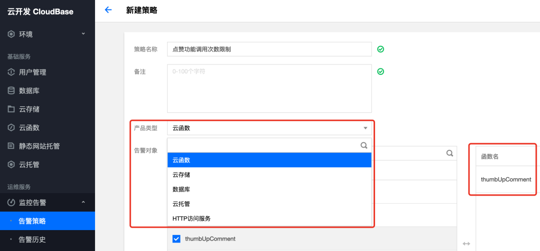 比如给点赞功能添加调用次数限制告警,先选择告警对象为 “云函数”: