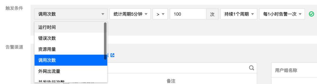 再配置触发条件,比如 5 分钟内调用次数超过 100 次则告警: