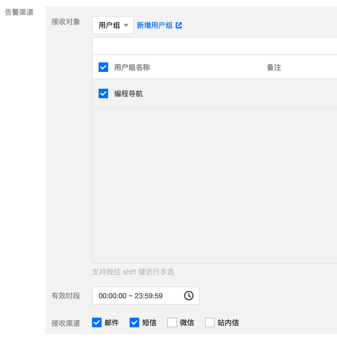 再配置下告警接收人、告警方式、时间段等,支持邮件、短信、微信等,选择很多样: