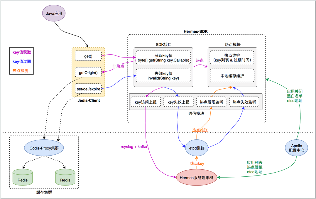 - 热 key 推送:当key的热度达到设定值时,推送热key信息至所有应用实例,各应用实例将key值进行本地缓存。