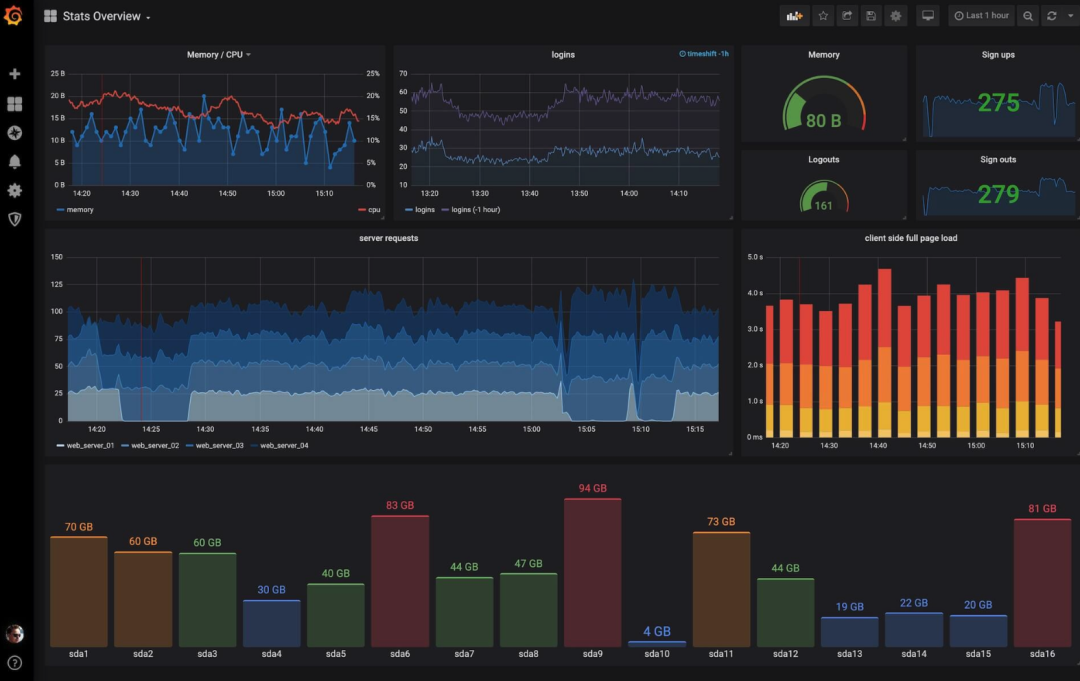 主流的时序数据库技术有 InfluxDB、TimescaleDB 等。一般情况下,建议将时序数据库配合 Grafana 监控看板一起使用,实现数据存储 + 快速可视化。